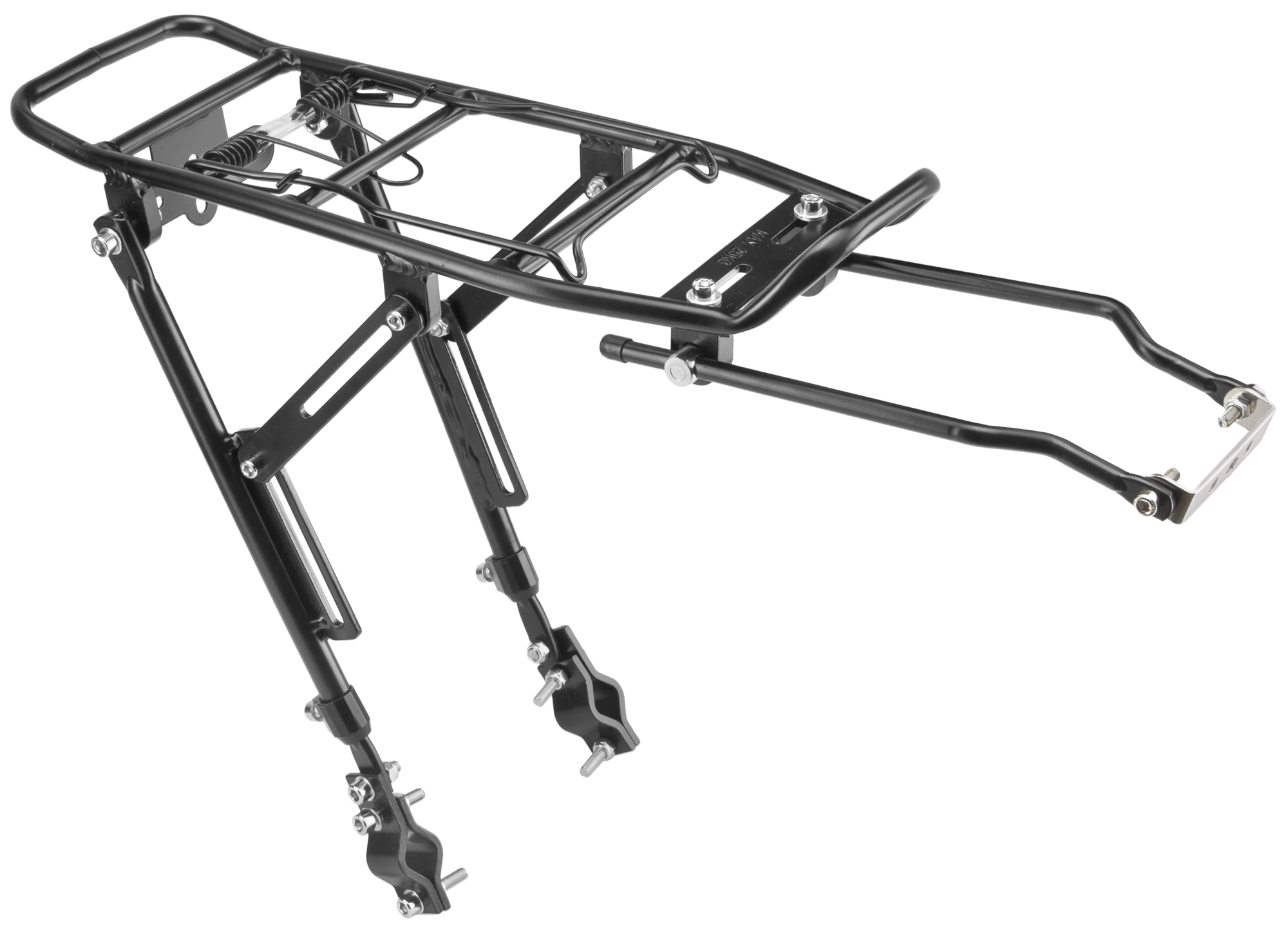 Багажник BLF-H2 универсальный разборный, с регулировкой высоты стоек с универсальными креплениями (крепится хомутами на верхние перья заднего колеса и в штатные отверстия), для велосипедов 24-29", алюминиевый, чёрный.