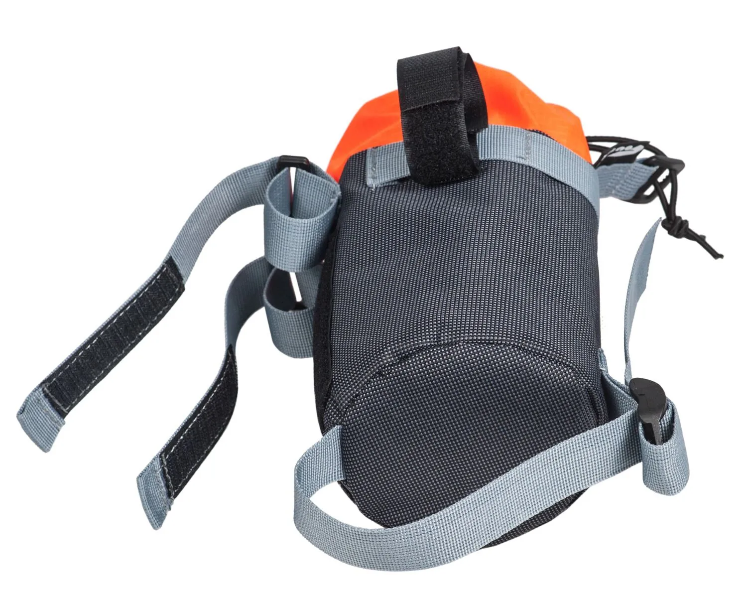 Нижняя часть велосумки-«кормушки» оттягивается стропой с пряжкой к короне вилки велосипеда, чтобы предотвратить раскачивание сумки.