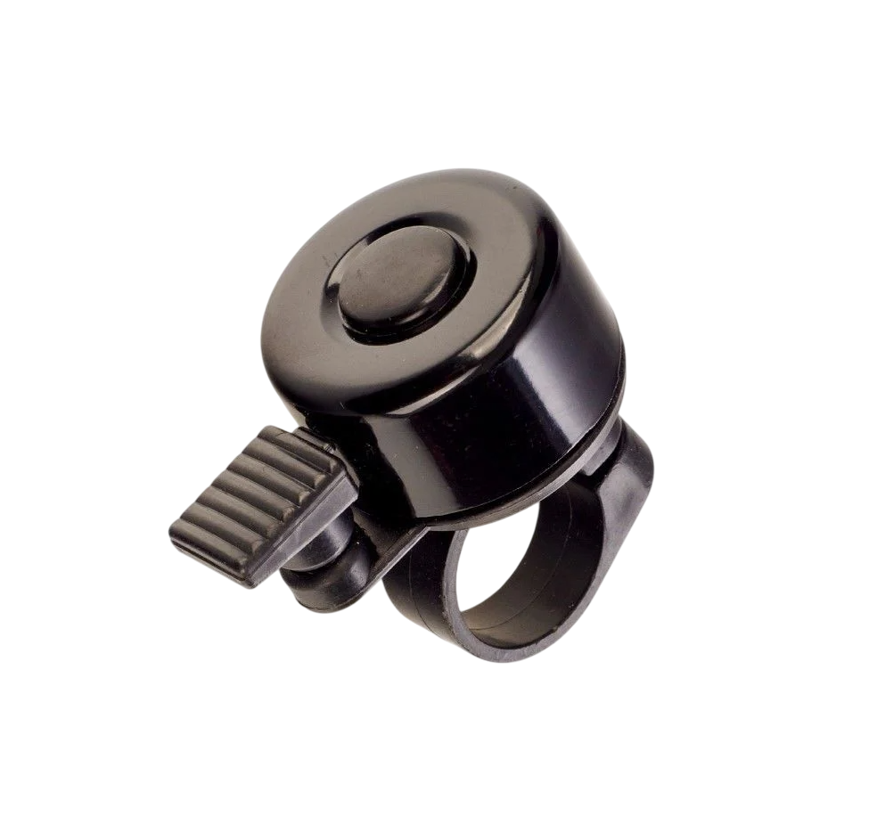 Классический звонок типа «молоточек» с надёжным креплением на руль. Основание выполнено из прочного пластика, верхняя часть — из лёгкого алюминия. Обеспечивает громкий и чёткий звук, хорошо слышимый на дороге.