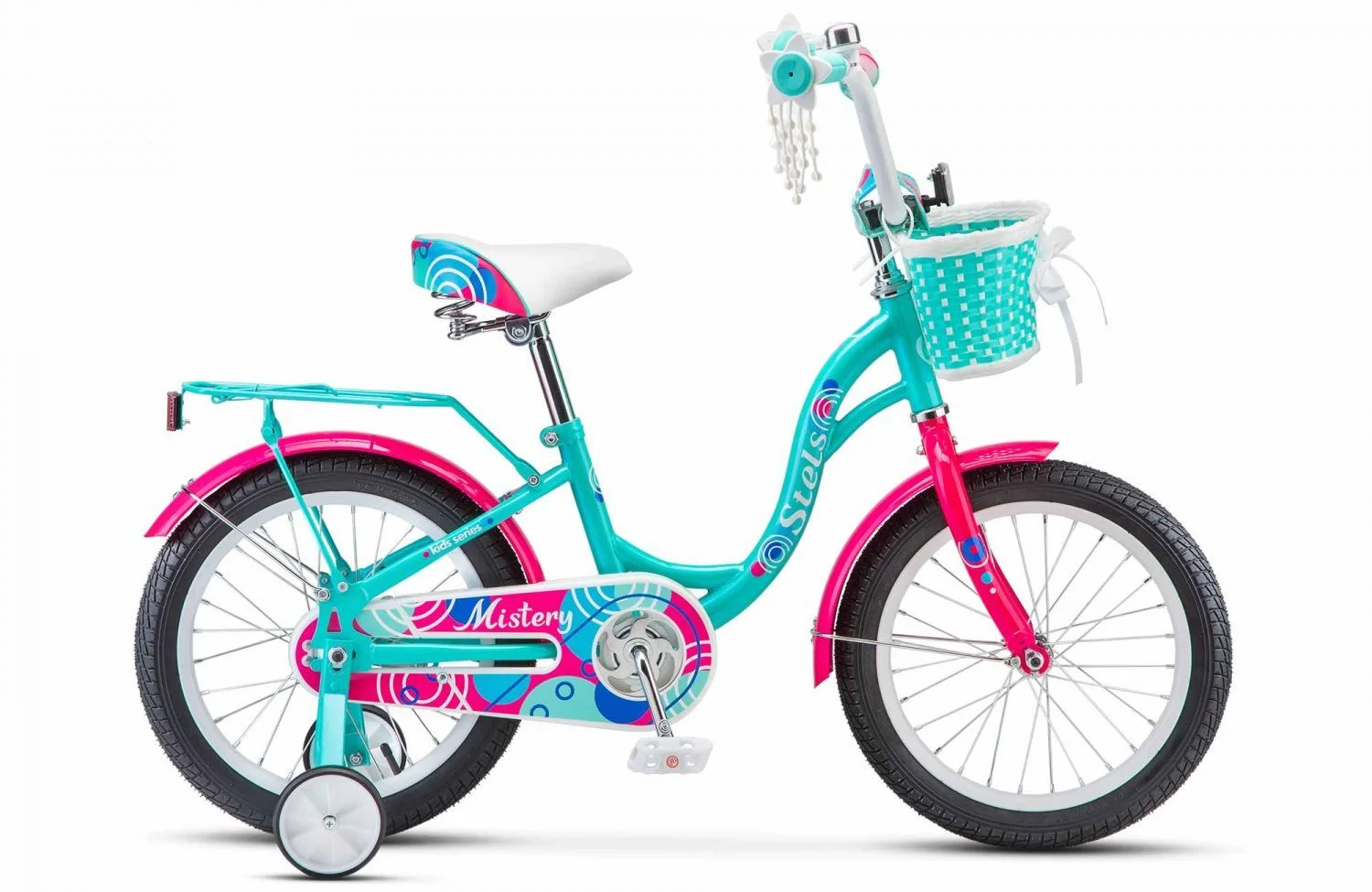 Детский велосипед Stels Mistery 16 — стильный и яркий велосипед для девочек. Байк подойдет даже для тех малышей, которые не могут еще держать равновесие на велосипеде. Удобная заниженная рама, позволяющая ребёнку легко садиться и слезать с велосипеда, изготовлена из высокопрочной стали. По бокам велосипеда установлены дополнительные съемные колеса для обучения катанию. Стальные крылья, защита цепи, багажник, звонок, корзинка в комплекте. Диаметр колес — 16 дюймов.Характеристики