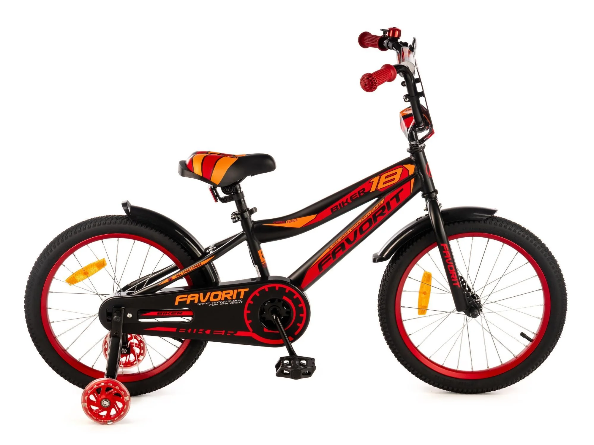 Детский велосипед Favorit Biker 18". Модель на 18-дюймовых колесах. Велосипед собран на базе прочной стальной рамы, которая готова к любым нагрузкам и испытаниям. Для более безопасного обучения катанию на велосипеде имеются приставные колеса, которые помогут научиться держать равновесие. За безопасную остановку отвечает простой и удобный ножной тормоз. Стильный дизайн обязательно понравится юному гонщику.Характеристики