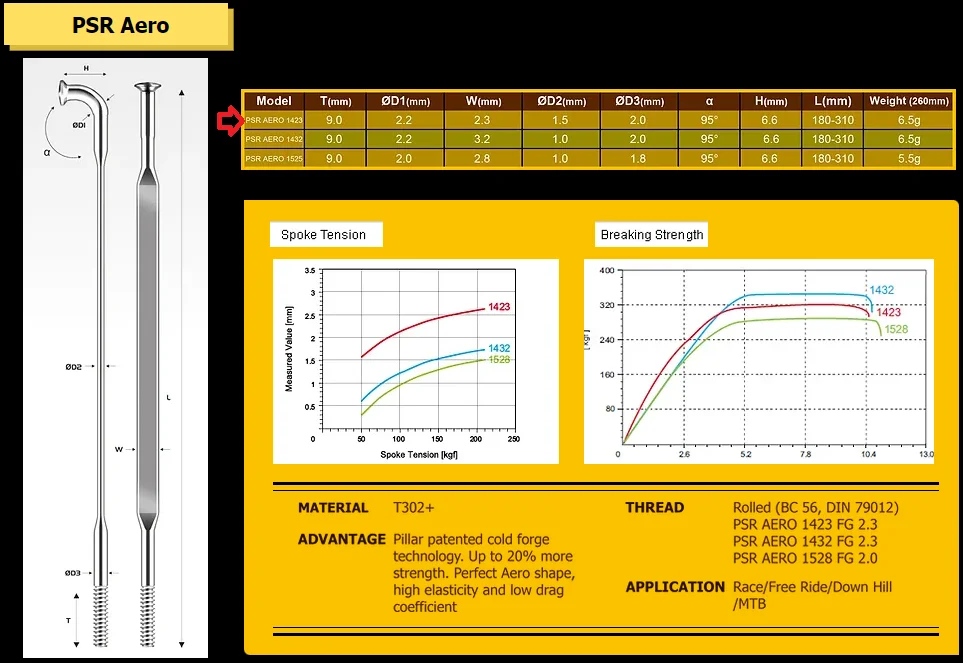 Аэродинамические спицы Pillar PSR AERO 1423, изготовленные запатентованным методом холодной штамповки и вытягивания, что обеспечивает выигрыш в весе на 20% при сохранении прочности спиц круглого сечения. Высокая эластичность и низкий коэффициент аэродинамического сопротивления. Благодаря видимой плоскости исключена продольная перекрутка спицы при ручной сборке колёс.