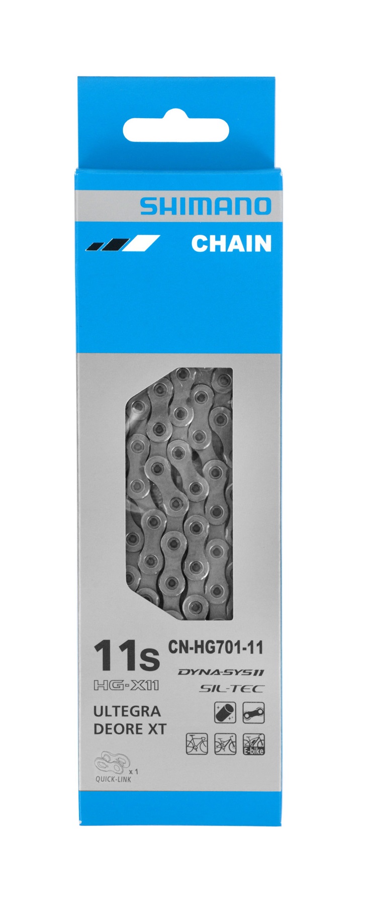 Shimano CN-HG701 — оригинальная 11-скоростная цепь премиум-класса для шоссейных, гравийных, MTB и e-bike трансмиссий Shimano. Модель разработана с применением технологий серий Ultegra / Deore XT и полностью совместима с системами HG-EV и Dyna-Sys11, обеспечивая максимально плавное, быстрое и бесшумное переключение передач даже под высокой нагрузкой.