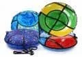 Тюбинг представляет из себя специально пошитый чехол в который вставляется камера, которая наполняется воздухом. Этот вид "санок" популярен не только среди детей, но и взрослых. Тюбинги бывают от 60 до 150 см в диаметре. Однако одними из самых популярных являются размеры: